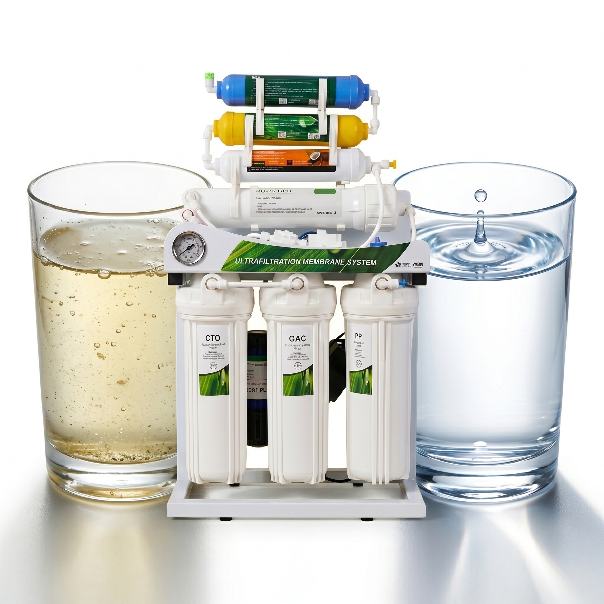 RO filtre à 0.0001 μm (élimine tout). UF filtre à 0.01 μm (préserve minéraux). AquaPure combine les DEUX.