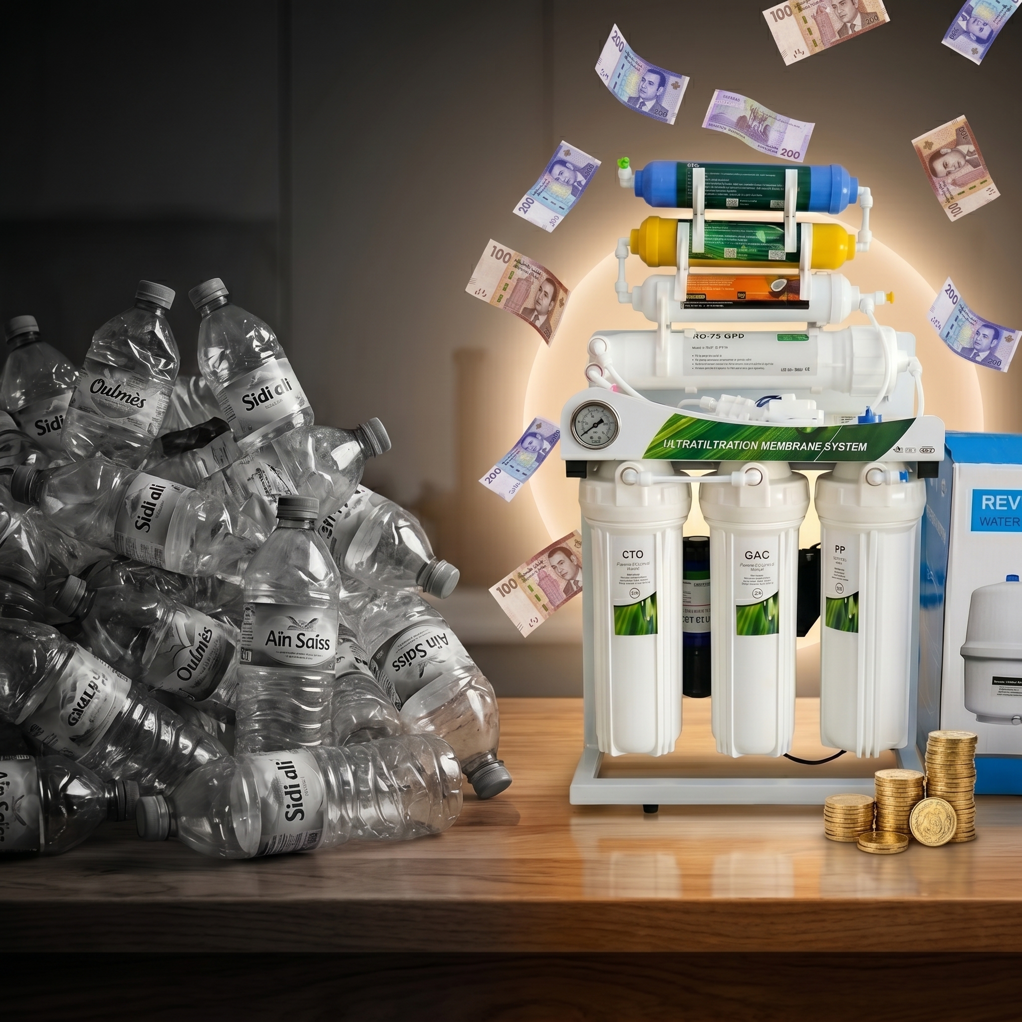 Les filtres PP, GAC, CTO se remplacent tous les 6-12 mois. La membrane RO dure 2-3 ans. Kit de remplacement annuel à 390 DH.